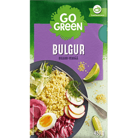 - Keitä GoGreen Bulgur pakkauksess aolevan ohjeen mukaan ja tarjoile paistettujen kasvispullien ja lopun lehtikaalin kera.